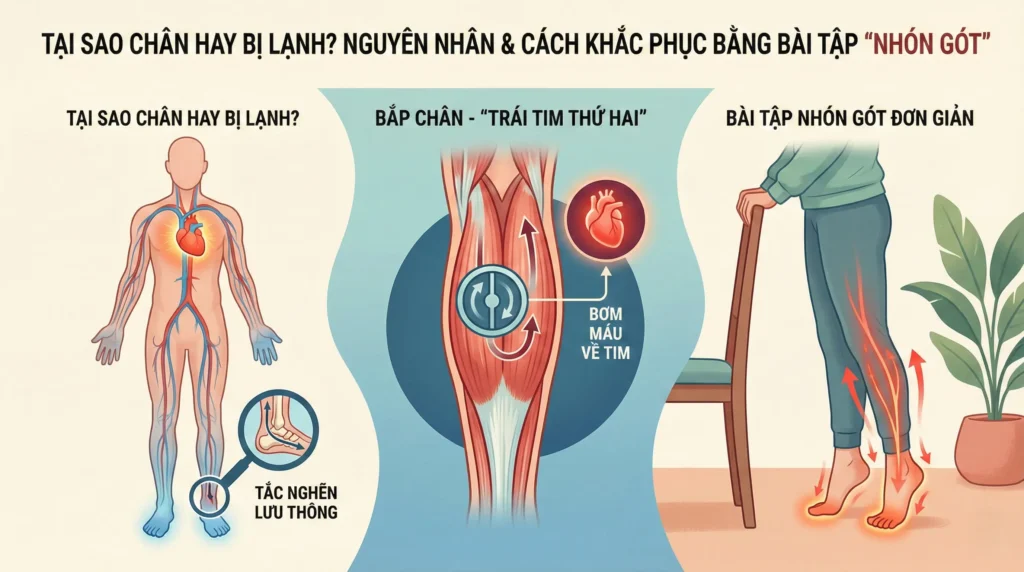 Đã bao giờ bạn cảm thấy dù đắp chăn rất dày nhưng bàn chân vẫn lạnh toát, hoặc ngồi làm việc trong phòng điều hòa mà cảm giác tê buốt chạy dọc từ gót chân lên chưa? Tình trạng lạnh chân và tê bì không chỉ gây khó chịu, ảnh hưởng đến giấc ngủ mà còn là dấu hiệu cảnh báo sức khỏe mà nhiều người thường bỏ qua. Đặc biệt với người lớn tuổi hoặc nhân viên văn phòng ít vận động, đây là vấn đề rất phổ biến. Bài viết này sẽ giúp bạn hiểu rõ nguyên nhân và hướng dẫn một bài tập cực kỳ đơn giản từ chuyên gia để khắc phục tình trạng này ngay tại nhà.